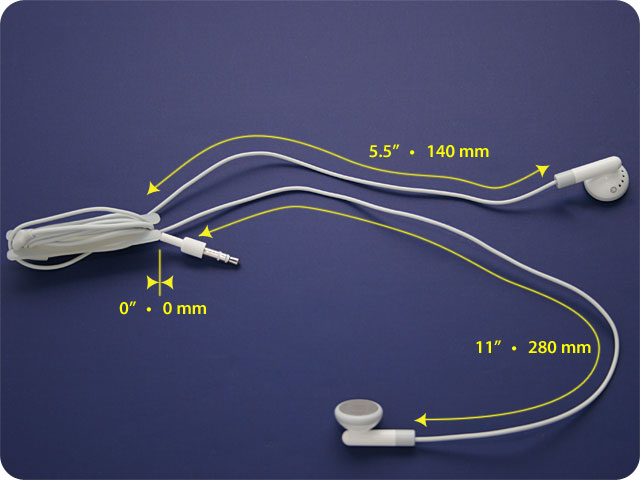 Step 1 Wind up the headset cord around the wire-spool. Give the right earbud wire an additional turn (in order to make it shorter). The length of wire left between the headset plug and the wire spool should be null. The two stretches of wire left between the earpieces and the wire-spool should measure respectively 5.5" (140 mm) for the right one and 11" (280 mm) for the left one. |