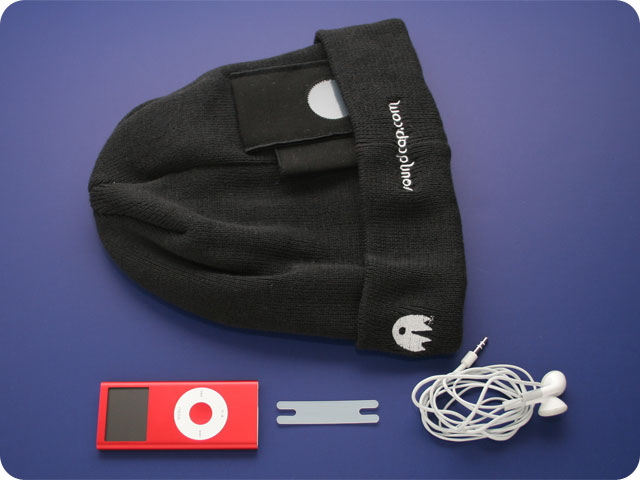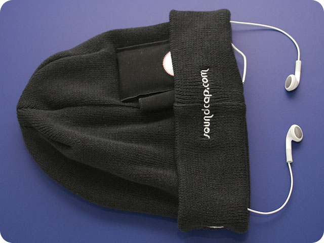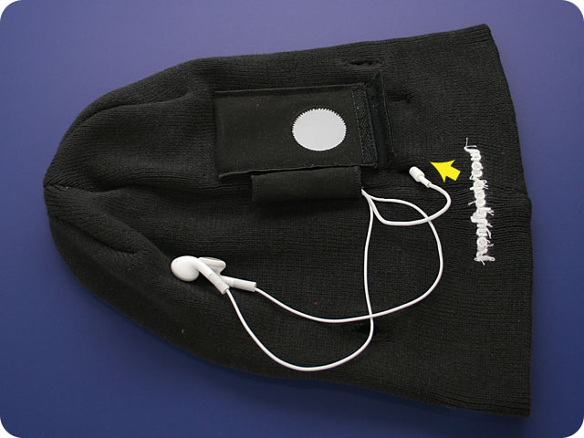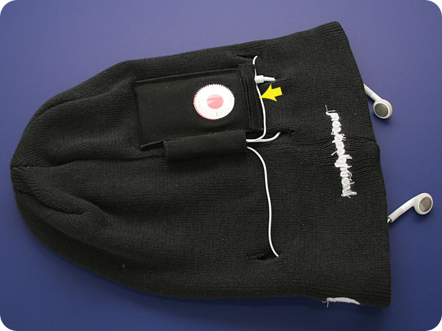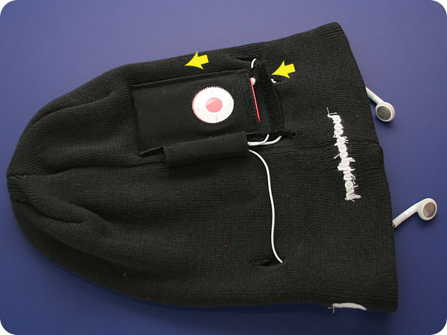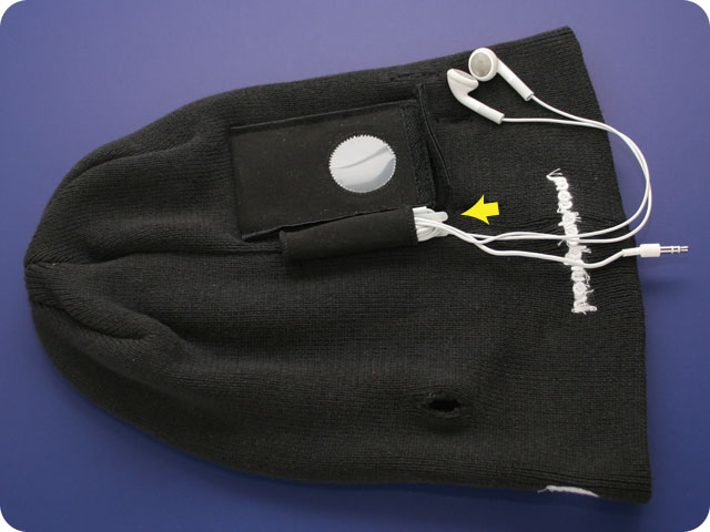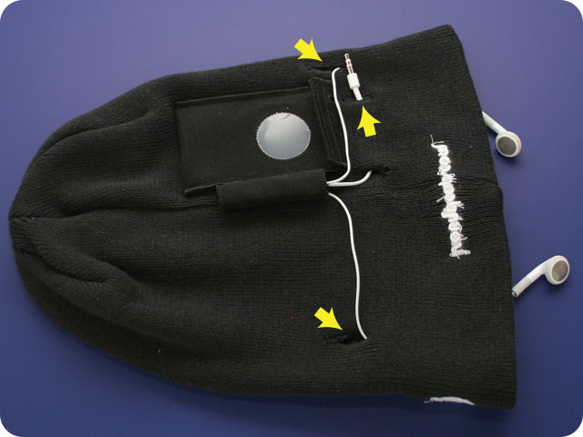 Step 7 Fold up the lower part of your cap so as to cover almost half of your player (the crease will run immediately beneath the earpiece eyelets). Done! Put it on and plug in your earbuds. |