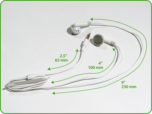 Step 1 Wind up the headset cord around the wire-spool. Give the right earbud wire an additional turn (in order to make it shorter). The length of wire left between the headset plug and the wire spool should be 2.5" (65 mm). The two stretches of wire left between the earpieces and the wire-spool should measure respectively 4" (100 mm) for the right one and 9" (230 mm) for the left one. |