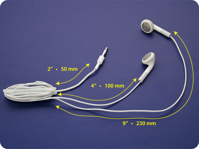 Step 1 Wind up the headset cord around the wire-spool. Give the right earbud wire an additional turn (in order to make it shorter). The length of wire left between the headset plug and the wire spool should be 2" (50 mm). The two stretches of wire left between the earpieces and the wire-spool should measure respectively 4" (100 mm) for the right one and 9" (230 mm) for the left one. |