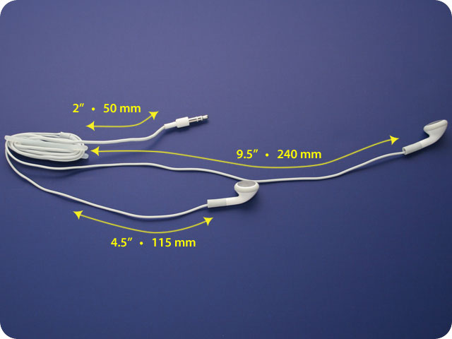 Step 1 Wind up the headset cord around the wire-spool. Give the right earbud wire an additional turn (in order to make it shorter). The length of wire left between the headset plug and the wire spool should be 2" (50 mm). The two stretches of wire left between the earpieces and the wire-spool should measure respectively 4.5" (115 mm) for the right one and 9.5" (240 mm) for the left one. |