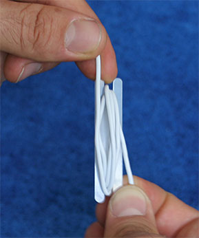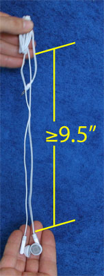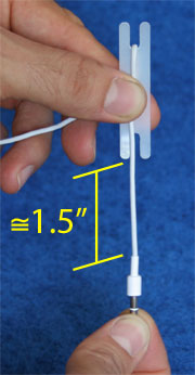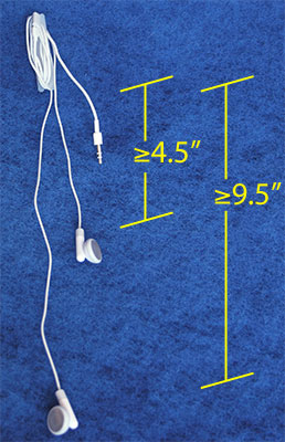 Step 4 & Step 5 Stop winding up the cord when the part of it hanging from the spool reaches a length close to 9.5" (measure just the cord, not the ear-pieces). As per Figure 4 both left and right earpieces should be at the same distance respect to the spool. Should the total hanging cord length be less than 9.5", unwind one loop from the spool. Stop winding the wire corresponding to the left earpiece. Keep winding up the wire that corresponds to the right earpiece, until the hanging part of that wire approximates 4.5" in length. Even in this case, a slightly longer wire is preferable over a slightly shorter one (unwind if necessary). |