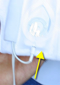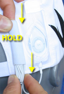 Step 7 Insert your iPod® into the player pocket. The headset jack needs to point downwards. Once in place, make sure the stereo minijack on your iPod® is aligned to the opening at the bottom of the player pocket. |