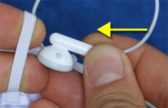 To remove your iPod®, just disconnect the headset connector from the stereo minijack, then pull the player out of the pocket. Should you need to remove your headset, follow the procedure illustrated above in reverse order. To remove the wire bundle from the elastic band, DO NOT pull the wires (damage may occur), instead hold the elastic pocket and push down with one finget from the top opening, then grab and pull the wire bundle as per Figure 15. |