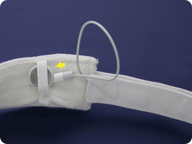 Step 5 Stretch the elastic loop (internally located over the sweatband, next to the Velcro® strap) and pass the left earbud through it (the loop supports the wire and makes the left earbud fall next to the left ear). |